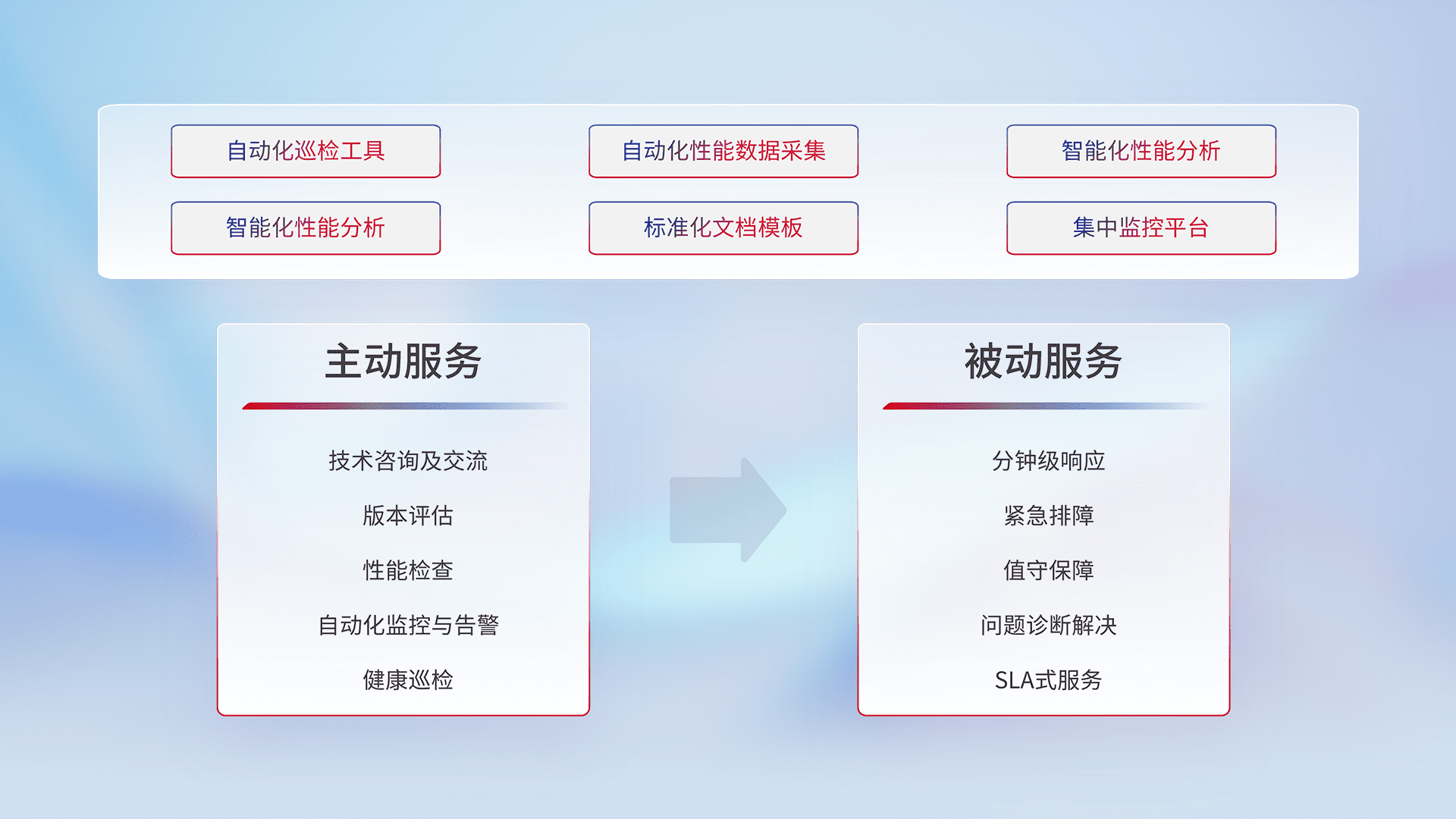 智能化工具和标准化文档,,保障服务质量,,,,提供主动服务(包含技术咨询、、、版本评估、、、性能检查、、自动化监控与告警、、、健康巡检)和被动服务包含(分钟级响应、、、紧急排障、、、、值守保障、、、、问题诊断解决、、、、SLA服务)。。
