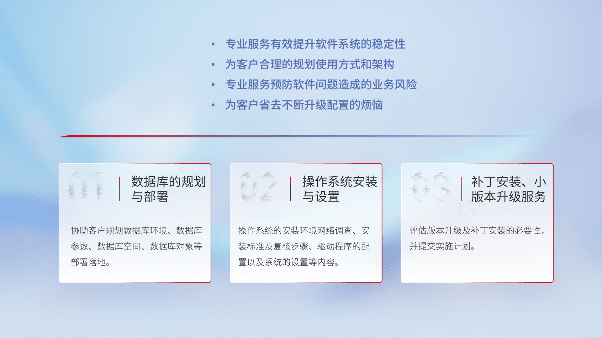 为客户提供软件规模升级、、快速部署、、、、按需配置的专业服务,,从数据库的规划与部署到操作系统的安装与设置,,再到补丁安装和小版本升级提供支持。。。